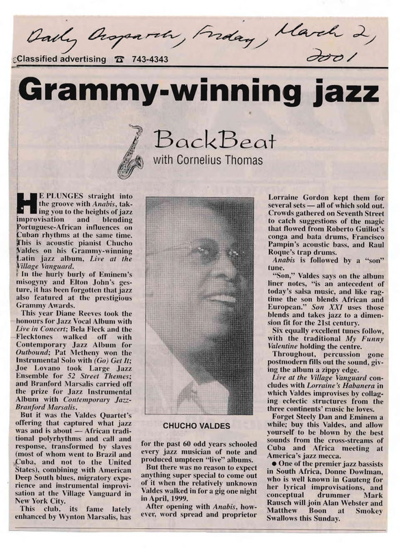 - Photocopied article from the newspaper The Daily Dispatch about Chucho Valdes, a jazz musicians