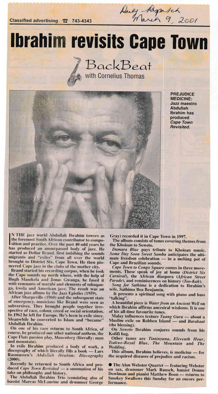 - Photocopied article from the newspaper The Daily Dispatch about Abdullah Ibrahim, a jazz musician