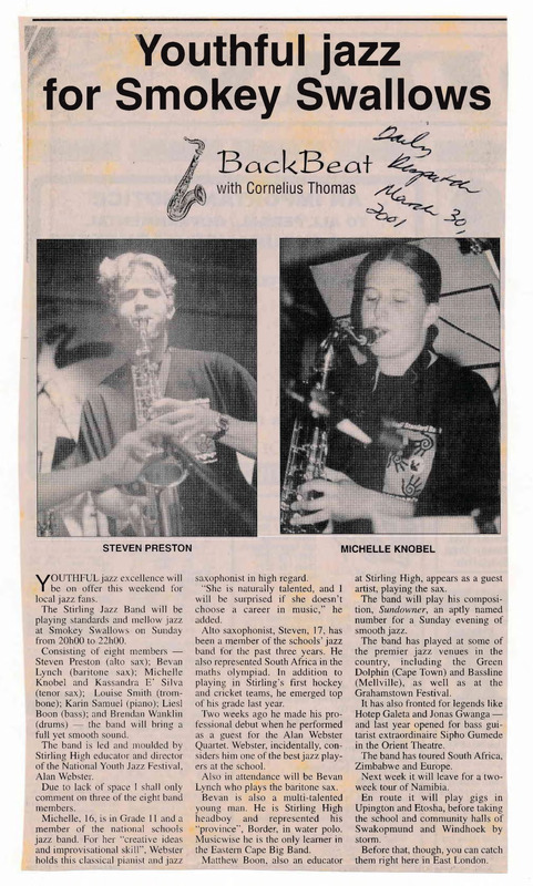 - Article by Cornelius Thomas published in the Daily Dispatch newspaper about the Stirling Jazz Band, featuring jazz musicians Steven Preston and Michelle Knobel.