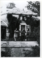 Chris McGregor, Dudu Pukwana and an unidentified man outside a hotel