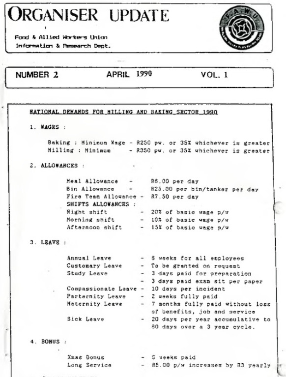 Organiser Update is the newsletter of the Food and Allied Workers’ Union (FAWU), a South African trade union representing workers in the food processing, beverage, agriculture, and allied industries. The publication functioned as an internal communication medium, circulating information to union members, organisers, and shop stewards on workplace conditions, labour disputes, collective bargaining processes, union activities, and relevant social and political developments. The newsletter records aspects of trade union organisation through workplace and regional reports, policy statements, educational material, and commentary on contemporary national events. The collection documents organised labour activity in South Africa during the late twentieth and early twenty-first centuries and constitutes a primary source for the study of labour history, industrial relations, political organisation, and working-class experiences. -