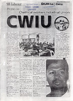 Chemical Workers Industrial Union (GW1U) CW1U wus launched in November 1074 following a wuvo of strikes by workers in Durban, who wero demanding bettor wages. During those dark yours when repression wus at its highest peak, workers hud no hade unions to assist them. In chemical, transport, textile and .paper industries, workers formed trade unions to take their struggle forward. They also formed a tight .federation, the Trade Union Advisory and Co-ordinating Committee (TUACC). At its launch in 1974, CWIU was concentrated in Durban and had just under 1 000 members. In July 1980, a branch was opened in the "old†Transvaal. In building a national union, CWIU merged with Glass and Allied Workers Union (Gawu) in 1982. In the interim, other branches where launched throughout the country, though it was easy task with security cops keeping surveillance on every movement of union officials. To build a stronger united worker-front, CWIU took quantum leap when it merged again with Plastics and Allied Workers Union in 1986.