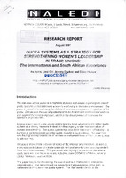 The intention of this paper is to highlight debates and issues regarding the use of guota systems in strengthening women's leadership in the labour movement. The paper is aimed at broadening the debate from mere acceptance or rejection of the guota. Debates on the use of guotas tend to be heated and controversial and can lose sight of the central objective, which is the development of strategies for women's empowerment. A large proportion of trade unions internationally have adopted forms of the quota system as a strong measure to deal with the ongoing under-representation of women in leadership. The quota system has also been introduced effectively in a number of parliaments all over the world, including South Africa. The countries with the highest representation of women in parliament have all had to use quotas to achieve this. The paper draws from a review of some of the international literature, as well as interviews undertaken with trade unionists and parliamentarians (see Appendix A for a list of interviewees). This paper will also highlight some examples where quota systems have been adopted, including three COSATU affiliates, namely CWIU, NEHAWU and SAMWU. -