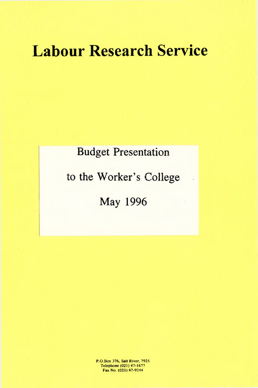 - Budget presentation to the Workers' College, May 1996