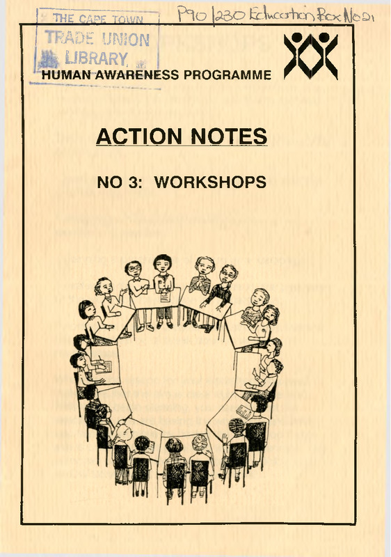 This document, titled "Action Notes: No. 3: Workshops", is a practical instructional pamphlet designed to assist activists and community organisers in the systematic planning of educational and strategic sessions. It serves as a methodology guide for the "popular education" style frequently employed by South African trade unions and political organisations.