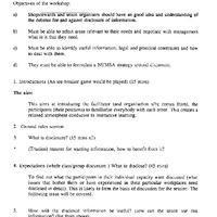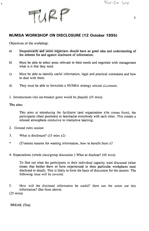 This document serves as a facilitator’s guide for a workshop on disclosure, hosted by the National Union of Metalworkers of South Africa (NUMSA) on 12 October 1995. The material was developed by the Trade Union Research Project (TURP) and details the pedagogical methods and introductory procedures for the session.