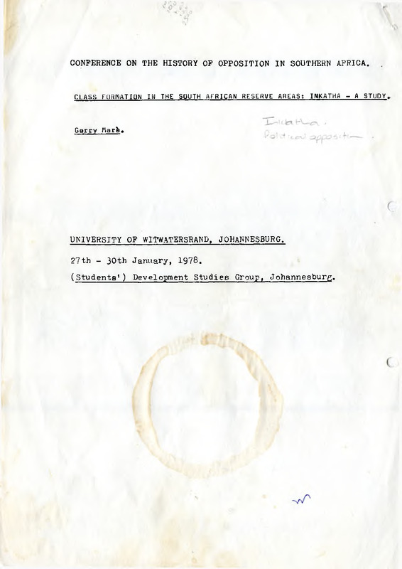 - The Inkatha movement has received, large publicity over the few years since its revival and especially recently with the formation of an alliance between Inkatha, the ("Coloured") labour Party and the ("Indian") Reform Party, Thi3 paper was done to suggest a possible approach, for discussion, to the analysis of current political, ideological and economic developments in the reserve areas of the South African social formation. More specifically the paper hopes to provide information that could be relevant to an analysis of developments in the kwaZulu region. An elaboration of the hints at an approach, integration of factors relating to the stage of capitalism in the South African social formation and class struggle would have made this a more satisfactory paper for discussion. The approach adopted has to be extremely tentative at this stage, both because of the immediate and obvious problems associated with contemporary research and analysis (It is even less possible to approach the subject with "objectivity", to "distance oneself from it", than is the case with topics that can more properly be called "history") but also because of the dearth of material available on the reserve "homeland" areas and the difficult y of doing research in these areas. (Wages Commission research into conditions on wattle plantations, Cosmas Desmond and others and their work on resettlement etc., and subsequent responses to these investigations, give some idea of the sensitivity of thin work), In the first section I will introduce certain concepts relating to an analysis of the "homelands" through some recent writing on these areas. References will be to the kwaZulu region. The second section deal.3 specifically with the Inkatha movement. Information relating to this movement is provided and one issue is presented in greater detail, hut no rigorous attempt is mado to apply the mode of analysis of the first section to the issues around the position of 'Inkatha. Indicators exist but with so many dynamics operative they can be no more than that. However, I do not believe that it is possible to understand the political, economic and ideological developments in the "homelands" without keeping the questions raised in the first section in mind - and definitely impossible to come to an adequate understanding if these areas are looked at in isolation, ie if apparently "internal" events and processes are not situated within a context broadly defined by the specific stage of the development of capitalism in South Africa (monopoly dominance), and without keeping in mind the history of class struggle within the social formation.,Class formation in the South African reserve areas: Inkatha - a study