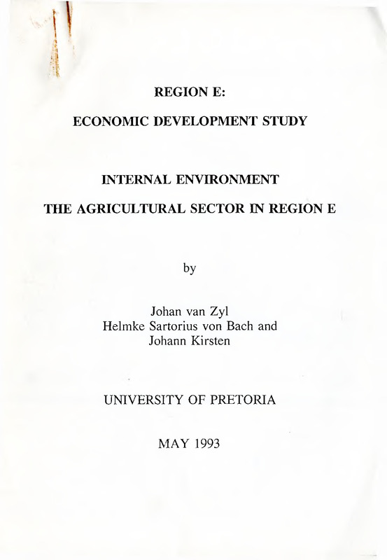 - The main purpose of this report is to conduct an analysis with a view to determine the potential role and contribution of agriculture in region E. This report emphasises the agricultural impact in determining an economic development strategy for region E. It is therefore the aim of this report to provide a brief situation analysis and an interpretation of existing problems affecting development. The importance of the sector, implications of the spacial distribution, the structure, potential growth and the policy environment will be addressed. From the above, constraints, bottlenecks, the likely future demand, etc will be pointed out. The interpretation of the above and its implications for development is necessary to determine objectives for the aimed strategy. The strategy for region E is necessary in determining policies stressing economic growth and fair distribution of resources to enable the mass of the population to share in increased wealth and economic opportunities.,Region E economic development study