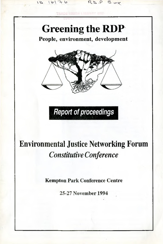 Greening the RDP: people, environment, development: report of proceedings [of the] Environmental Justice Networking Forum Constitutive Conference, Kempton Park Conference Centre, 25-27 November 1994