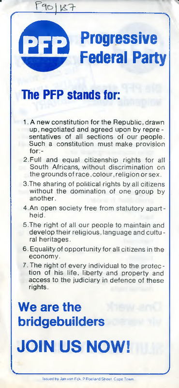 PFP, Progressive Federal Party: the PFP stands for-,PFP, Progressiewe Federale Party: die PFP staan die vogende voor-