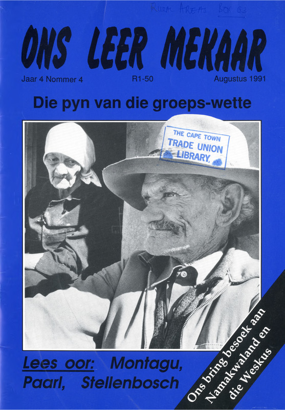 - A community education magazine documenting grassroots struggles and social initiatives in the Western Cape. Key features include an investigation into the Montagu Woodworkers Co-operative (a worker-owned business), a travel report on land struggles in Namakwaland and Elandskloof, and a profile on "Ma Karriem," a Worcester activist and poet. The issue also addresses the housing crisis in Stellenbosch (SHAC) and includes practical "Hulp-hoekie" advice on homemade soap to counter the high cost of living.