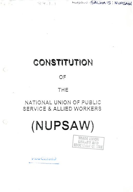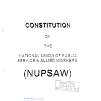 - This document is the constitution of the National Union of Public Service and Allied Workers (NUPSAW), adopted in 1998. It sets out the union’s foundational principles, objectives, organisational structures, membership provisions, and governance procedures. The constitution provides insight into the formation and early institutional framework of a public sector trade union in South Africa during the late apartheid period.