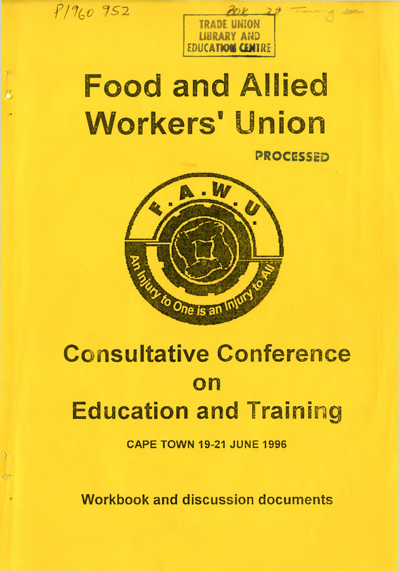 - A collection of discussion documents and opening remarks from the 1996 FAWU conference on Education, Training, and Development (ETD). The text highlights the union's shift toward viewing ETD as a tool for economic liberation, moving workers away from low-skilled, low-security labour toward career progression. It specifically addresses the alignment between worker development and industrial productivity through tripartite consultation between labor, the state, and employers.
