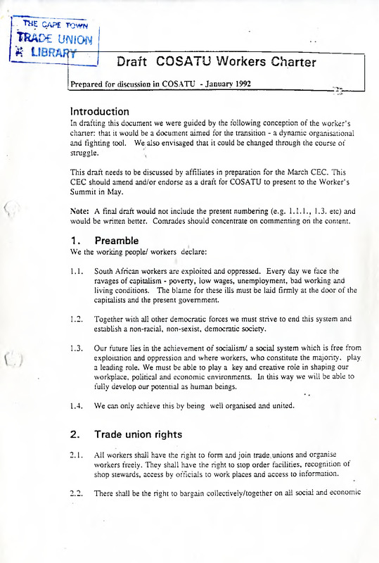 - Draft COSATU Workers Charter prepared for discussion in COSATU, January 1992