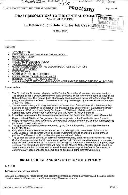 - A comprehensive draft resolution delegated by the 6th National Congress to the Central Committee. It serves as a unified policy framework, integrating resolutions from COSATU affiliates and findings from the "September Commission" (The Commission on the Future of the Unions). The document synthesizes a decade of policy conferences (1992–1997) to form the labor movement's formal proposal for the Presidential Jobs Summit. It covers economic policy, health and safety, and living wage mandates, wielding the same authority as a National Congress resolution.