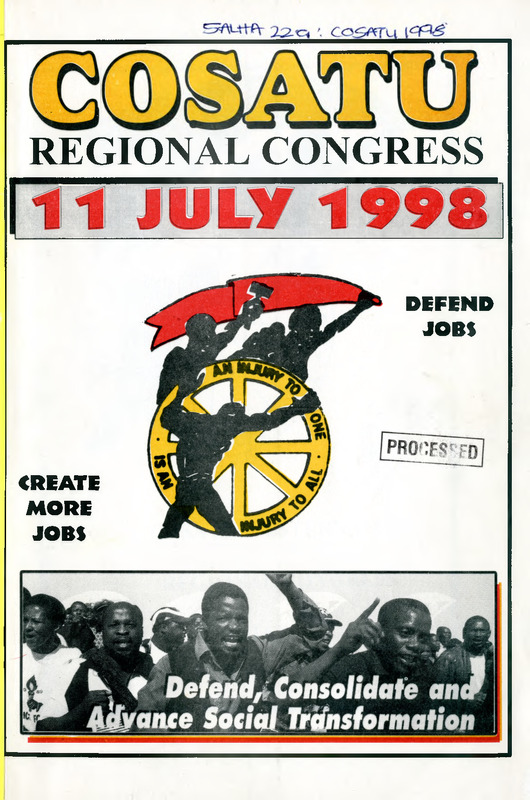 - Records of the COSATU Western Cape Regional Congress held on 11 July 1998. The congress focused on mobilizing workers in the Western Cape province under the national theme of "Defend, Consolidate and Advance Social Transformation." Key agenda items included regional strategies for the 1999 General Elections, local government delivery, and addressing job losses in the regional textile and agricultural sectors.