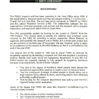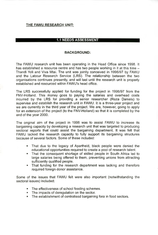 - A report or institutional summary of the Food and Allied Workers' Union (FAWU) Research Unit's operations from 1998 to 2000. It details the unit's establishment at the Head Office as a joint venture with the Labour Research Service (LRS), funded by FNV-Holland. Key personnel mentioned include Thandi Yoli, Viva Mtai, and Reza Daniels. The unit's primary objective was to increase FAWU’s bargaining capacity through the production of sectoral reports.