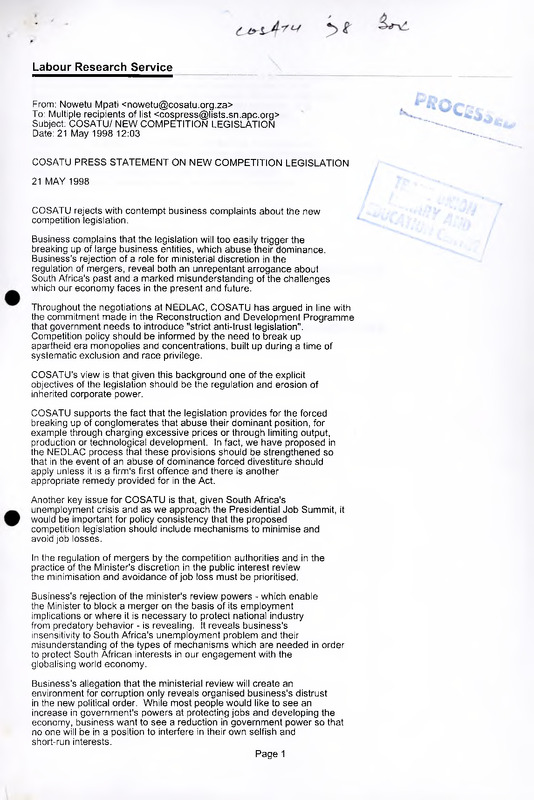 - A 1998 press statement outlining COSATU’s support for "strict anti-trust legislation." The document rejects business opposition to ministerial discretion in merger regulation and advocates for the forced divestiture (breaking up) of conglomerates that abuse their dominant market position. Key focus areas include the erosion of inherited corporate power, the prevention of excessive pricing, and the inclusion of "public interest" criteria—specifically the protection of jobs—in merger reviews.