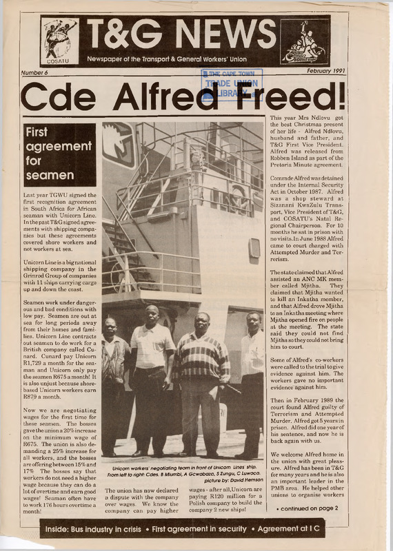 - A 4-page edition documenting the first recognition agreement for African seamen with Unicorn Lines and the release of T&GWU Vice President Alfred Ndlovu from Robben Island. It features reports on the "Bus Industry in Crisis" campaign, the first-ever security sector recognition agreement with Fidelity Guards, and industrial action within the "Bantustans" (homelands) of KaNgwane and Transkei.