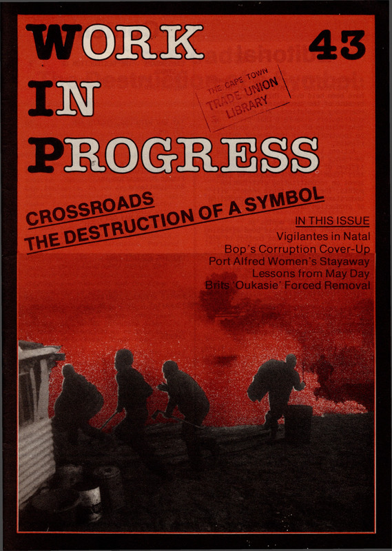 - A 48-page issue documenting the intensification of internal conflict under the State of Emergency. The lead article by Josette Cole analyses the destruction of the Crossroads squatter camp by "wit-doeke" (vigilantes). Other reports cover the emergence of Inkatha-aligned vigilantes in Natal, the persecution of ethnic minorities in Bophuthatswana, the launch of UWUSA as a rival to COSATU, and women’s resistance to rape in Port Alfred. The issue also tracks the June 16 stay-away and the sentencing of Helene Passtoors.