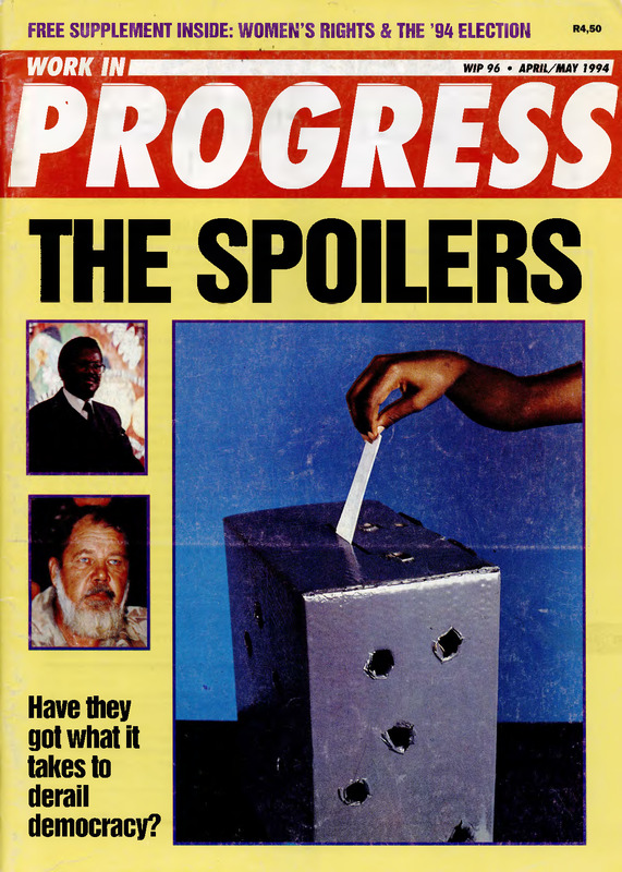 - A 66-page issue published during the final countdown to the 1994 elections. The central theme, "The Spoilers," analyzes the threat posed by the white Right and "apartheid's bastard children" to the democratic process. Key features include scenarios for right-wing reaction, the role of the Peace Accord, a report on the war in Angola, and a supplement on women's rights and the election. It also features a major debate on the future of the SACP and the "Socialist Conference."