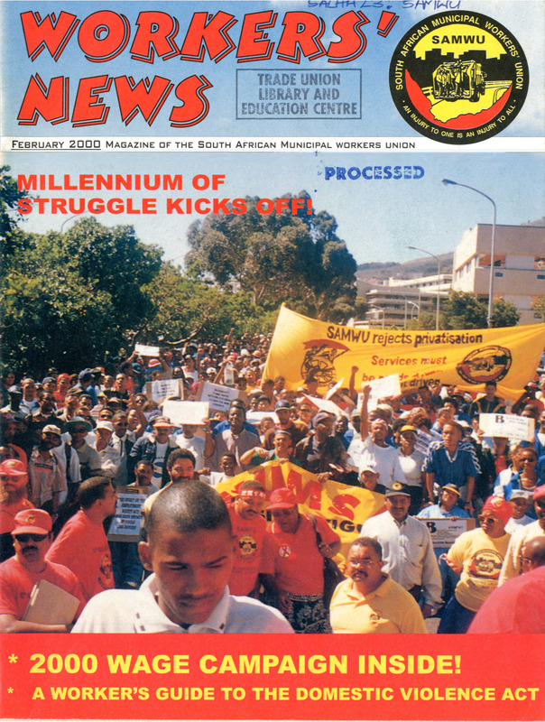 - Entering the new millennium, this issue outlines the 2000 Wage Campaign and the union's continued resistance to iGoli 2002. Notably, it includes a worker's guide to the Domestic Violence Act, showing the union's expansion into social justice issues outside the immediate workplace. It also reports on international solidarity from unions in Canada and Australia.