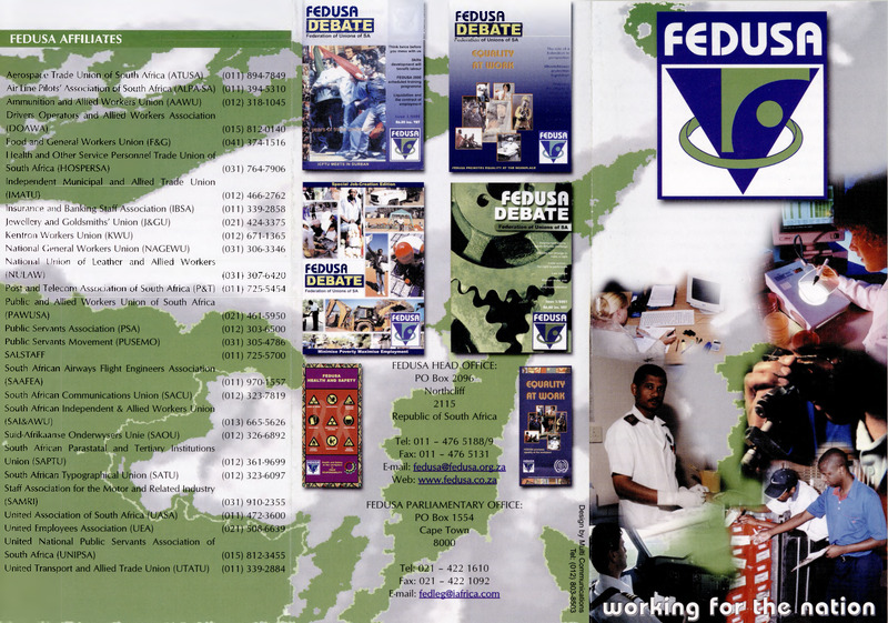 - The FEDUSA Parliamentary Office provides legislative support to the affiliate members in the form of outputs ranging from publishing National Executive Reports, preparing and presenting oral and written submissions to the parliamentary portfolio committees in National Parliament as well as the publishing of a parliamentary affiliate newsletter on newsworthy issues being discussed in Parliament. A Bill Profile which serves as a reference document includes profiles of all legislation tabled in National Parliament, as well as monitoring and tracking progress through Parliament. The Bill Profile is an interactive service available through electronic media to all affiliate members.