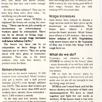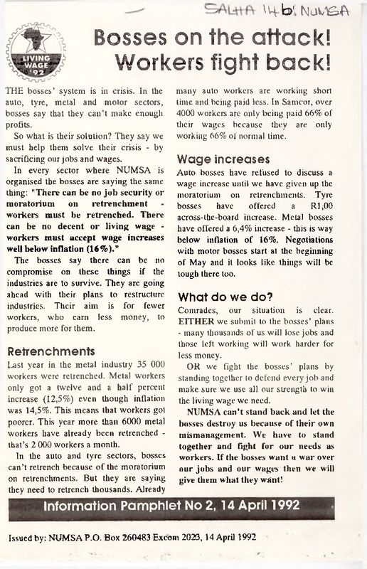 - THE bosses' system is in crisis. In the auto, tyre, metal and motor sectors, bosses say that they can't make enough profits. So what is their solution? They say we must help them solve their crisis - by sacrificing our jobs and wages. In every sector where NUMSA is organised the bosses are saying the same thing: "There can be no job security or moratorium on retrenchment workers must be retrenched. There can be no decent or living wage - workers must accept wage increases well below inflation (16%)." The bosses say there can be no compromise on these things if the industries are to survive. They are going ahead with their plans to restructure industries. Their aim is for fewer workers, who earn less money, to produce more for them.
