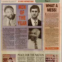 - ANC general secretary Cyril Ramaphosa (top left), and constitutional affairs and communications minister, Roelf Meyer, (top right) have been chosen as joint winners of New Nation's 'Man of the Year Awardâ€. The New Nation Award for "Businessman of the Year†goes to National Sorghum Breweries (NSB) chairperson, Professor Mohale Mahanyele (right). This is the first time that both awards are being made. The awards will be given annually in future in recognition of individuals who are deemed to have made a contribution in providing leadership for the general uptiftment of the people of South Africa. Ramaphosa and Meyer have been chosen for their tireless efforts in holding the negotiations process together during very arduous and difficult times. The rapport the two have struck has made a crucial difference as to whether the negotiations process flounders or goes forward. The two leaders are young and are likely to provide continuity and the excellent leadership that the transition period requires. Prof Mahanyele has provided bold imaginative leadership in the business world. He has placed black economic empowerment firmly on the agenda and has set his own company as an example of this. New Nation believes that it is business leaders like Prof Mahanyele who will ensure that black people reclaim their rightful place in the economic life of the country. The awards will be officially presented to their winners early in 1993. Democratic Party (DP) leader, Dr Zach de Beer, said: “The two (Ramaphosa and Meyer) have given all they could to get the negotiations process back on track... they deserve it.†The newly-appointed chief of the Development Bank of South Africa Prof Wiseman Nkuhlu said Prof Manyelele's achievement would “serve as a model to other black organisations involved in economic empowermentâ€.