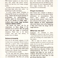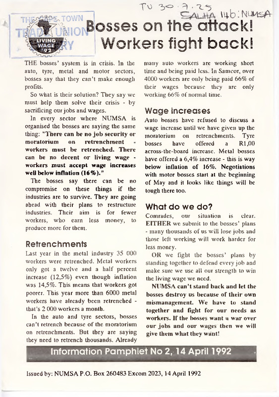 - THE bosses' system is in crisis. In the auto, tyre, metal and motor sectors, bosses say that they can't make enough profits. So what is their solution? They say we must help them solve their crisis - by sacrificing our jobs and wages. In every sector where NUMSA is organised the bosses are saying the same thing: "There can be no job security or moratorium on retrenchment workers must be retrenched. There can be no decent or living wage - workers must accept wage increases well below inflation (16%)." The bosses say there can be no compromise on these things if the industries are to survive. They are going ahead with their plans to restructure industries. Their aim is for fewer workers, who earn less money, to produce more for them.