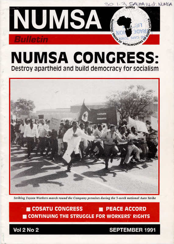 - In this Bulletin we focus on the NUMSA and COSATU Congresses which were held in June and July this year. We also cover the National Peace Accord in some detail. In covering NUMSA's Third National Congress we focus on the major points discussed and contributions from guest speakers. We report on NUMSA's current membership and who the new Office Bearers are. We also produce in full the Resolutions that were adopted at the Congress. We report briefly on the discussions, debates and the resolutions that were finally passed at COSATU's Fourth National Congress. Unfortunately for reasons of space, we have not been able to print the resolutions adopted at this Congress. Shop stewards are therefore advised to contact their NUMSA Regional Office for a copy of the Minutes, Speeches and Resolutions of the Congress, or to contact COSATU Head Office which is due to produce a resolutions booklet soon. Much has been achieved in the negotiations around a Peace Accord between the ANC Alliance, Inkatha Freedom Party and the National Party. The Accord is pages long and is very detailed. We have tried in this Bulletin to give an overview of its basic features. We hope the chart that goes with the article will help people understand the detail and complexity of it and why it goes much, much further than all previous Accords. The Accord has now been signed by most of the major parties on September 14. Watch the press for details of a new Act which is due to be passed within 30 days outlawing
