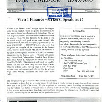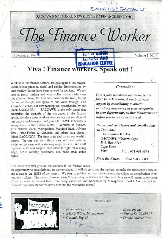 - Workers in the finance sector's struggle against low wages, unfair labour practice, racial and gender discrimination by their wealthy bosses have been ignored for too long. We are seen as pencil pushers and white collar workers who earn big salaries. Now, the time has come for the truth, to put the record straight and speak as one voice through. The Finance Worker, our own mouthpiece, spearheaded by our union SACCAWU. SACCAWU is the only union that recognises the struggle of the comrades in the finance sector, therefore those workers who are not yet members of our union should organise and join SACCAWU to become a strong force in the finance sector. Workers at Sanlam, Fust National Bank, Metropolitan, Standard Bank, African Bank, Price Forbes &. .Alexander and others have already joined SACCAWU. The time to sit and watch our wealthy bosses (fat cats ) in their flashy cars and huge palaces, whilst we go home with a starting wage, is over. We must organise, unite and support each other to fight for a liting wage, better working conditions, and basic trade union rights. This newsletter will give all the workers in the finance sector the opportunity to have their say on worker issues. It will be up to you the workers, to make this newsletter a success and a pain in the (SjSSS of the bosses. We plan to publish an issue every month, depending on contributions from vou, the workers. The names of workers who'll be sending, in articles and other contributions will remain anonymous if the}- so wish, to prevent them from bemg victimised and intimidated by Management. SACCAWU accept full editorial responsibility for the newsletter and the production thereof.