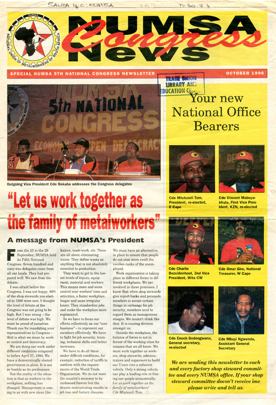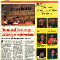 - From the 25 to the 29 September, NUMSA held its Fifth National Congress. Seven hundred and sixty-two delegates came from all our locals. They had prepared well. We saw from the debate. I was afraid before the Congress. I was not happy. 80% j of the shop stewards you elected in 1996 were new. I thought the level of debate at the Congress was not going to be high. But I was wrong - the level of debate was high. We must be proud of ourselves. Thank you for mandating your representatives to Congress - that is what we mean by worker control and democracy. We are doing our work under different conditions compared to before April 27, 1994. We have a democratically elected government in place. It is not as hostile as its predecessor. But the reality of the situation is that as workers in the workplace, nothing has changed. Management is coming to us with new ideas like kaizen, team-work, etc. These are all about eliminating waste. They define waste as anything that is not absolutely essential to production. They want to get to the lowest levels of inputs, equipment, material and workers. This means more and more control over workers' time and activities, a faster workplace, longer and more irregular hours. They standardise jobs and make the workplace more regimented. So we have to focus our efforts collectively on our “core business†- to represent our members effectively. We have to fight for job security, training, technical skills and better increases. We have to do all these under difficult conditions, for example, reduction of tariffs to conform with the requirements of the World Trade Organisation. We do not want the country's economy to be cushioned forever but the drastic restructuring results in job loss and factory closures. We must have an alternative in place to ensure that people do not once more swell the swollen ranks of the unemployed. Work organisation is taking place in different forms in different workplaces. We are involved in these processes. I know that when shop stewards give report backs and persuade members to accept certain things in exchange for job security, members tend to regard them as management stooges. We mustn't think like that. It is causing division amongst us. Outside the workplace, the balance of forces is not in favour of the working class for reasons that we all know. We must work together as workers, shop stewards, administrators and organisers to build our Union into a coherent vehicle. Only a strong vehicle can play a leading role in freeing our people economically. Let us work together as the family of metalworkers!