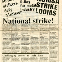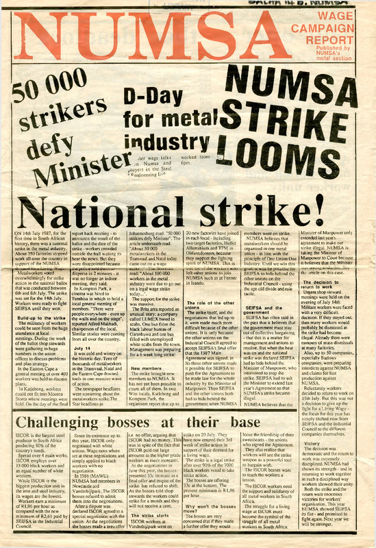 - ON 14th July 1987, for the first time in South African history, there was a national strike in the metal industry. About 350 factories stopped work all over the country in support of the NUMSA demand for a living wage. Metalworkers voted overwhelmingly for strike action in the national ballot that was conducted between 6th and 8th July. The strike was set for the 14th July. Workers were ready to fight SEIFSA until they won. The militancy of workers could be seen from the huge attendance at local meetings. During the week of the ballot shop stewards were gathering in huge numbers in the union offices to discuss problems and plan strategy. In the Eastern Cape a general meeting of over 400 workers was held to discuss plans.