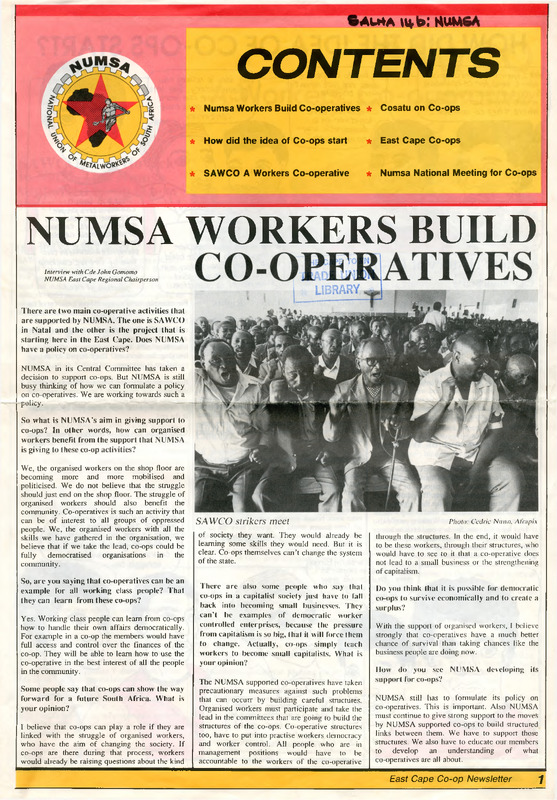 - There are two main co-operative activities that are supported by NUMSA. The one is SAWCO in Natal and the other is the project that is starting here in the East Cape. Does NUMSA have a policy on co-operatives? NUMSA in its Central Committee has taken a decision to support co-ops. But NUMSA is still busy thinking of how we can formulate a policy on co-operatives. We are working towards such a policy. So what is NUMSA's aim in giving support to co-ops? In other words, how can organised workers benefit from the support that NUMSA is giving to these co-op activities? Interview with Cde John Gomomo NUMSA East Cape Regional Chairperson We, the organised workers on the shop floor are becoming more and more mobilised and politicised. We do not believe that the struggle should just end on the shop floor. The struggle of organised workers should also benefit the community. Co-operatives is such an activity that can be of interest to all groups of oppressed people. We, the organised workers with all the skills we have gathered in the organisation, we believe that if we take the lead, co-ops could be fully democratised organisations in the community.