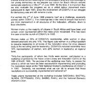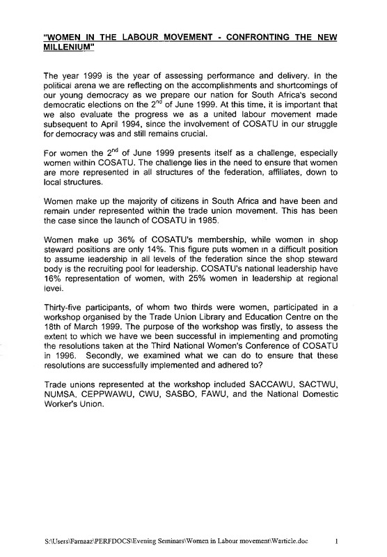 - The year 1999 is the year of assessing performance and delivery. In the political arena we are reflecting on the accomplishments and shortcomings of our young democracy as we prepare our nation for South Africa's second democratic elections on the 2nd of June 1999. At this time, it is important that we also evaluate the progress we as a united labour movement made subsequent to April 1994, since the involvement of COSATU in our struggle for democracy was and still remains crucial. For women the 2nd of June 1999 presents itself as a challenge, especially women within COSATU. The challenge lies in the need to ensure that women are more represented in all structures of the federation, affiliates, down to local structures. Women make up the majority of citizens in South Africa and have been and remain under represented within the trade union movement. This has been the case since the launch of COSATU in 1985.