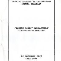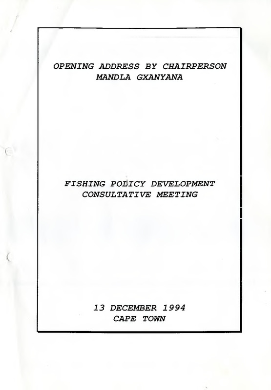 - On 27 October 1994 we met at the Good Hope Centre with the purpose of launching a process for developing a fisheries policy. The call of the meeting was driven by the problems and the situation faced by Fisher folk. Communities in the coastal areas are starving and living under bad conditions. These resources are not utilised to address these problems at present as stated in the RDP. The present system creates conflict between individuals and between regions. Since the appointment of Mandla Gxanyana at the Good hope centre meeting lots of things have happened, consultation with regions, forums, organisation and individuals on how to take up this process and the formation of the committee. There was final agreement of bottom up approach. This approach encouraged region like Eastern Cape to take up the process and reported into the siting of the legislature of the Eastern Cape region. In KwaZulu Natal process of creating forum have started which include all the players. I hope this process will create a national Fishing Forum, which shall have committee in the different coastal communities, because RDP outline how our resource should be managed, that our communities are great pillar for the management of our resources.
