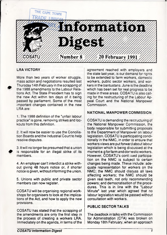- More than two years of worker struggle, mass action and negotiations resulted last Thursday 14th February in the scrapping of ^ the 1988 amendments to the Labour Relations Act. The State President has to sign the new Act within ten days of it being passed by parliament. Some of the most important changes contained in the new LRA are: The 1988 definition of the "unfair labour practice" is gone, removing strikes and lockouts from this definition. It will now be easier to use the Conciliation Boards and the Industrial Court to help resolve disputes. It will no longer be presumed that a union 0 is responsible for an illegal strike of its members. An employer can't interdict a strike without giving 48 hours notice or, if shorter notice is given, without informing the union. Unions with public and private sector members can now register. COSATU will be organising regional workshops for organisers to look at the implications of the Act, and how to apply the new provisions.
