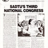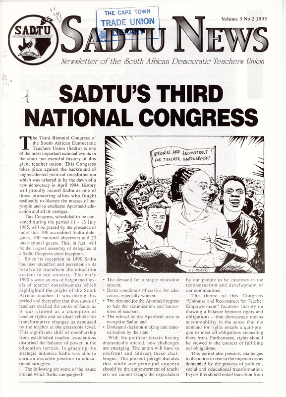 - The Third Biennial Congress of the South African Democratic Teachers Union (Sadtu) is one of the most important national events in the short but eventful history of this giant teacher union. This Congress takes place against the backround of unprecedented political transformation which was ushered in by the dawn of a new democracy in April 1994. History will proudly record Sadtu as one of those pioneering allies who fought resiliently to liberate the masses of our people and to eradicate Apartheid education and all its vestiges. This Congress, scheduled to be convened during the period 11-13 July 1995, will be graced by the presence of more that 700 accredited Sadtu delegates, 100 national observers and 20 international guests. This, in fact, will be the largest assembly of delegates at a Sadtu Congress since inception. Since its inception in 1990 Sadtu has been steadfast and persistent in its resolve to transform the education system in our country. The early 1990's were an era of heightened levels of teacher consciousness which highlighted the plight of the South African teacher. It was during this period and thereafter that thousands of teachers swelled the ranks of Sadtu as it was viewed as a champion of teacher rights and an ideal vehicle for transformative changes as espoused by the teacher at the grassroots level. This significant shift of membership from established teacher associations disturbed the balance of power in the education terrain. In grasping the strategic initiative Sadtu was able to earn an enviable position in educational struggles.