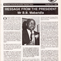 - On behalf of SADTU I wish to thank teachers generally and members of the Union in particular, for their valuable contribution to the success of the recent elections, The Union's stated commitment to educate the masses on voting was demonstrated by the large numbers of our members who were involved in voter education in their respective communities. In spite of the high rate of illiteracy, there was a negligible number of spoilt papers. I also wish to congratulate Professor S .M.E. Bengu on being appointed National Minister of Education. We assure him and his colleagues in the provinces of the Union's support as long as their dealings with teachers is democratic and not patronising. To all our Comrades who made it to parliament - both regionally and nationally - Congratulations! It is with a sense of pride and achievement that we South Africans of all persuasions, were able to pull off this remarkable feat that has ushered in, what appeared to some, an unattainable dream.