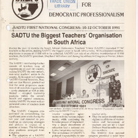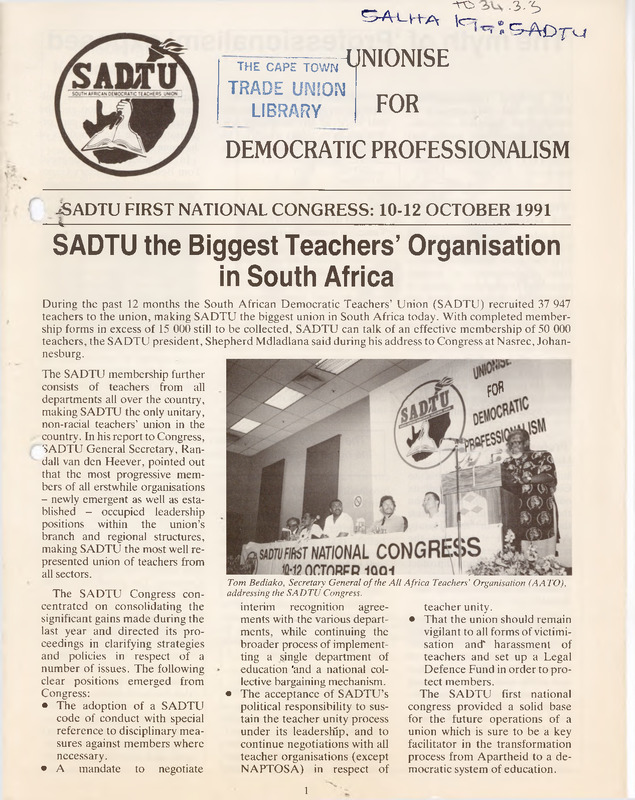 - During the past 12 months the South African Democratic Teachers' Union (SADTU) recruited 37 947 teachers to the union, making SADTU the biggest union in South Africa today. With completed membership forms in excess of 15 000 still to be collected, SADTU can talk of an effective membership of 50 000 teachers, the SADTU president, Shepherd Mdladlana said during his address to Congress at Nasrec, Johannesburg. The SADTU membership further consists of teachers from all departments all over the country, making SADTU the only unitary, non-racial teachers' union in the country. In his report to Congress, SADTU General Secretary, Randall van den Heever, pointed out that the most progressive members of all erstwhile organisations - newly emergent as well as established - occupied leadership positions within the union's branch and regional structures, making SADTU the most well represented union of teachers from all sectors.
