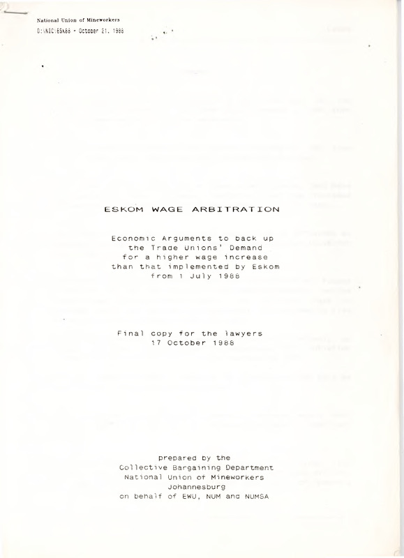 - Eskom increased the wages of general workers by 10% from 1 July- 1988, after the unions had rejected a 12% offer. The trade unions declared a dispute with Eskom, and have demanded a 20% wage increase (including the 10% increase implemented unilaterally), to be backdated to 1 July 1988. This document outlines the case for a higher wage increase than that granted by Eskom. All the wage calculations and projections assume that the increased wage will be back-dated to 1 July 1988. This report has been written by the Collective Bargaining Department of the National Union of Mineworkers in collaboration with the Labour Research Service in Cape Town.