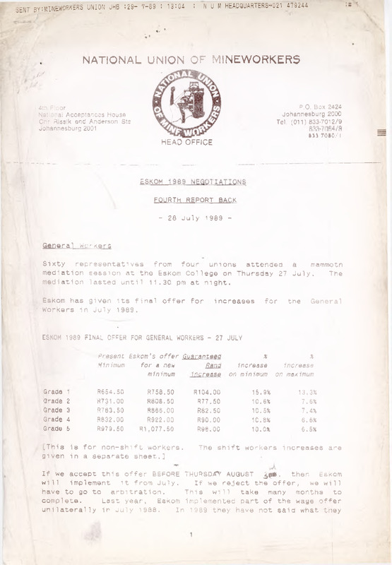 - Sixty representatives from four unions attended a mammoth mediation session at the Esxom College on Thursday 27 July. The mediation lasted until 11.30 pm at night. Eskom has given its final offer for increases for the General Workers in July 1989.