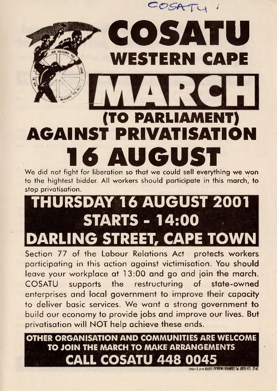 - Section 77 of the Labour Relations Act protects workers participating in this action against victimisation. You should leave your workplace at 13:00 and go and join the march. COSATU supports the restructuring of state-owned enterprises and local government to improve their capacity to deliver basic services. We want a strong government to build our economy to provide jobs and improve our lives. But privatisation will NOT help achieve these ends