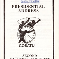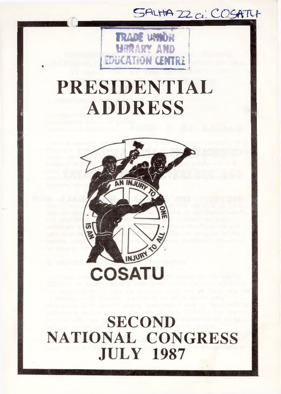 - Comrade delegates International and local guests Friends and compatriots I wish to welcome you to COSATU's Second National Congress This Congress is taking place at a time when the conflict between the forces trying to maintain the system and the forces of social progress is hotter then ever; when masses of our people are in a state of near permanent upsurge and when nearly everyone is now realising that the apparent iron fortress of the ruling class is breaking down. As we are meeting today, we are doing so united by the deep-seated feeling that victory is certain. Because of that, we must be clear that our Congress is an important milestone in our march towards our total freedom. With unity and clarity of purpose, we must deliberate on all the issues that are put before this Congress and take such decisions as are necessary to take the struggles of the working class in particular, and of the mass democratic movement in general, forward.