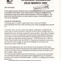 - In this report we have focused more on policy issues than on an assessment of problems in the region, as we need to use our Regional Congresses in preparation for the issues which will be debated at National Congress. The government and the bosses are also trying to stop us making further gains. How do we respond? STATE OF THE NATION In the past year, a number of gains have been made by COSATU, some demands have been won, but many new areas of struggle have opened up. In the past year, a number of gains have been made by COSATU, some demands have been won, but many new areas of struggle have opened up. In October 1990, the SCN accord was signed, which gave us back the old Unfair Labour Practice definition, and also set the scene for introducing new legislation for farm, domestic and public sector workers. Since then, a number of unions have been meeting with sub-committees of the National Manpower Commission as well as the Commision for Administration (CFA) to argue for basic rights and legislation for these workers. COSATU now has a national Public Sector Forum under the COSATU Organising Department, and we are gearing up for this struggle as well as the struggle for an entirely and progressive Labour Relations Act.