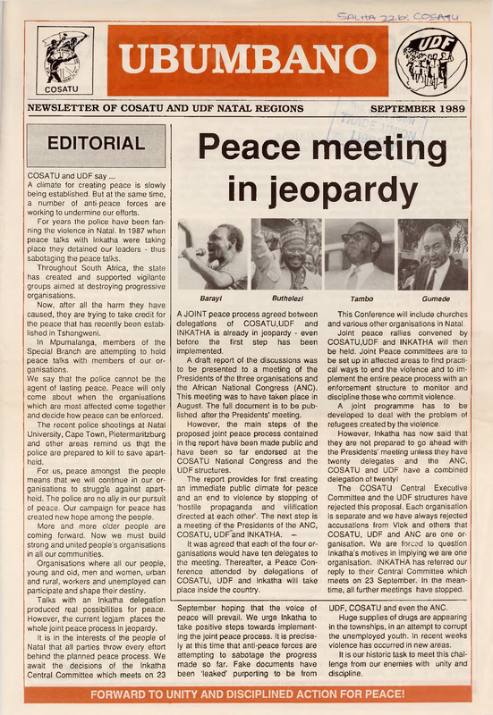 Newsletter of COSATU and UDF Natal regions - Peace meeting in jeopardy