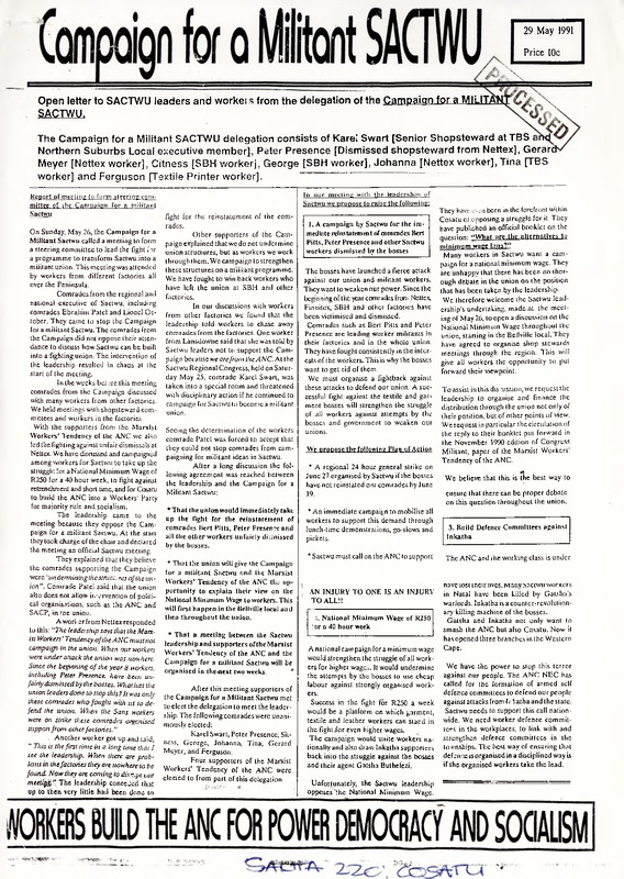 - On Sunday, May 26, the Campaign for a Militant Sactwu called a meeting to form a steering committee to lead the fight for a programme to transform Sactwu into a militant union. This meeting was attended by workers from different factories all over the Peninsula. Comrades from the regional and national executive of Sactwu, including comrades Ebrahim Patel and Lionel October. They came to stop the Campaign for a militant Sactwu. The comrades from the Campaign did not oppose their attendance to discuss how Sactwu can be built into a fighting union. The intervention of the leadership resulted in chaos at the start of the meeting.