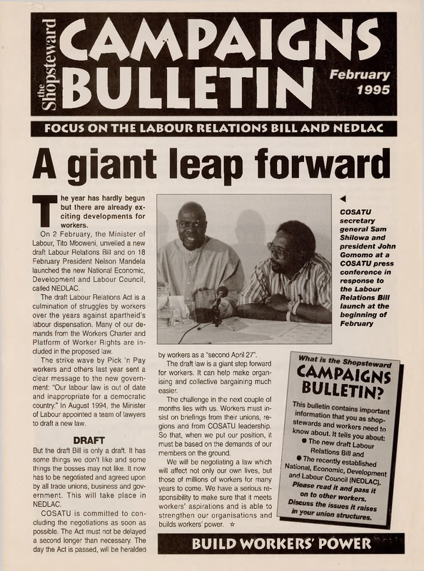 - The year has hardly begun but there are already exciting developments for workers. On 2 February, the Minister of Labour, Tito Mboweni, unveiled a new draft Labour Relations Bill and on 18 February President Nelson Mandela launched the new National Economic, Development and Labour Council, called NEDLAC. The draft Labour Relations Act is a culmination of struggles by workers over the years against apartheid's labour dispensation. Many of our demands from the Workers Charter and Platform of Worker Rights are included in the proposed law. The strike wave by Pick 'n Pay workers and others last year sent a clear message to the new government: “Our labour law is out of date and inappropriate for a democratic country.†In August 1994, the Minister of Labour appointed a team of lawyers to draft a new law.