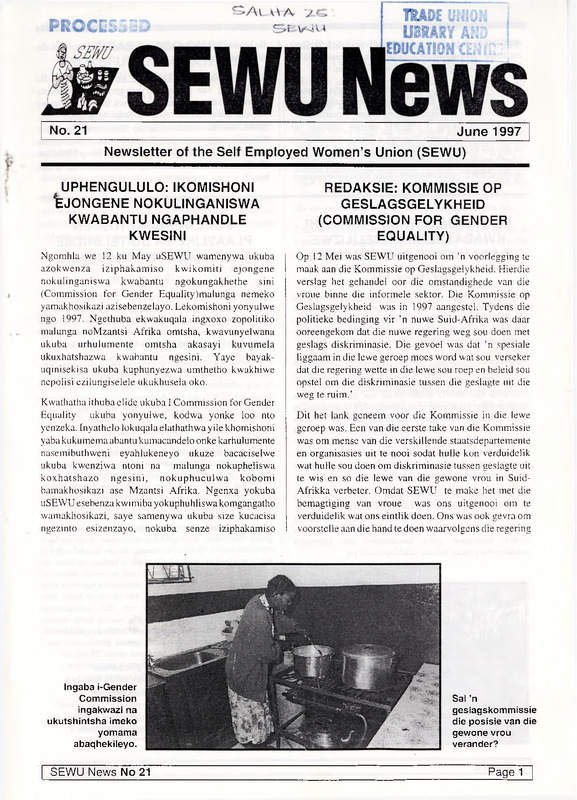 - Newsletter of the Self Employed Women's Union (SEWU). This issue details SEWU's presentation to the Commission for Gender Equality regarding the needs of women in the informal sector. It covers the challenges of cross-border trade for Zimbabwean women in Cape Town, and the ongoing struggle for self-employed women to access credit and banking services. It also discusses the establishment of member-led savings clubs to foster financial independence.